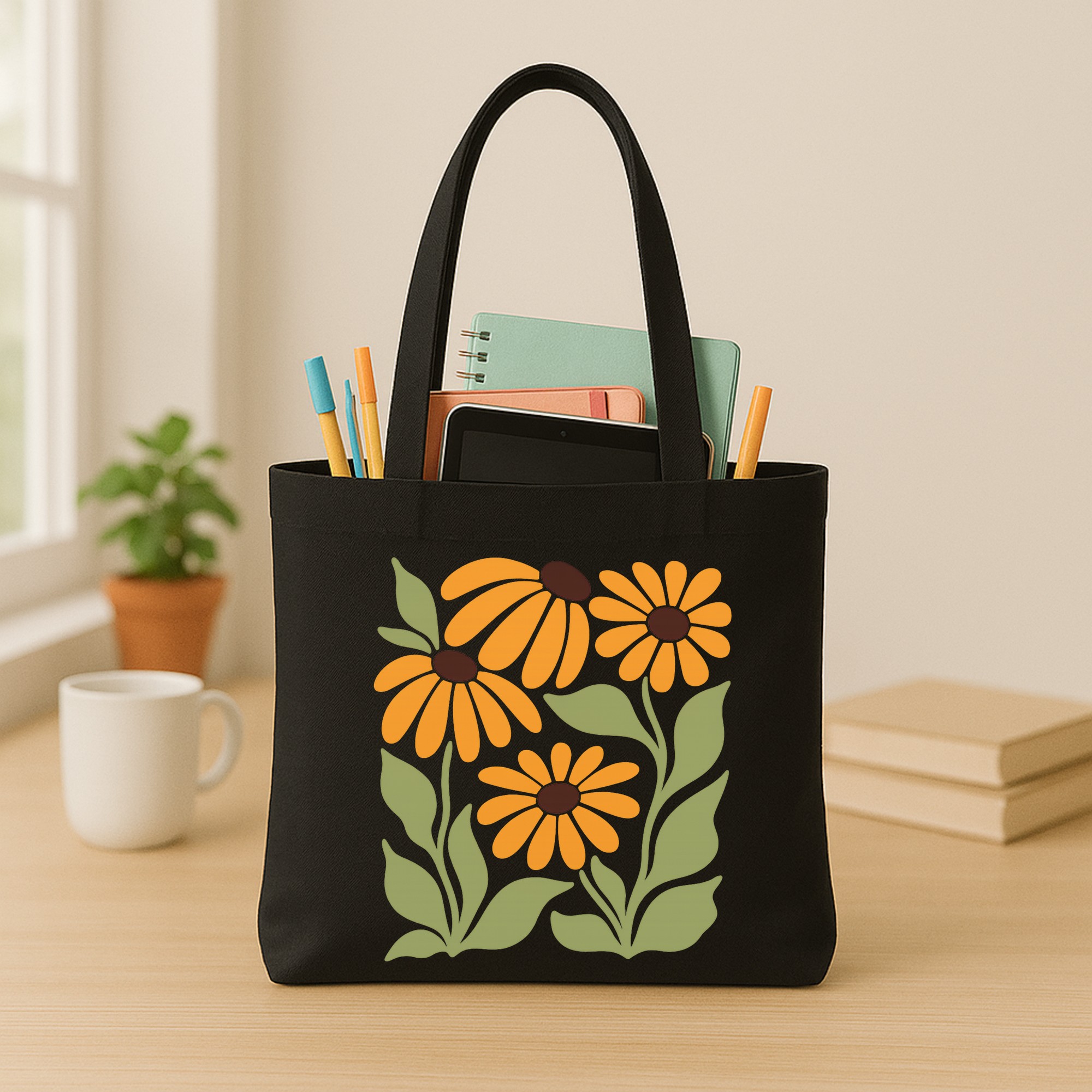 Vintage Contrast: The warm yellow sunflowers and sage green leaves stand out boldly against the pitch-black background. It gives off a cool, 70s retro rock vibe that is totally different from the usual “sweet” floral bags.