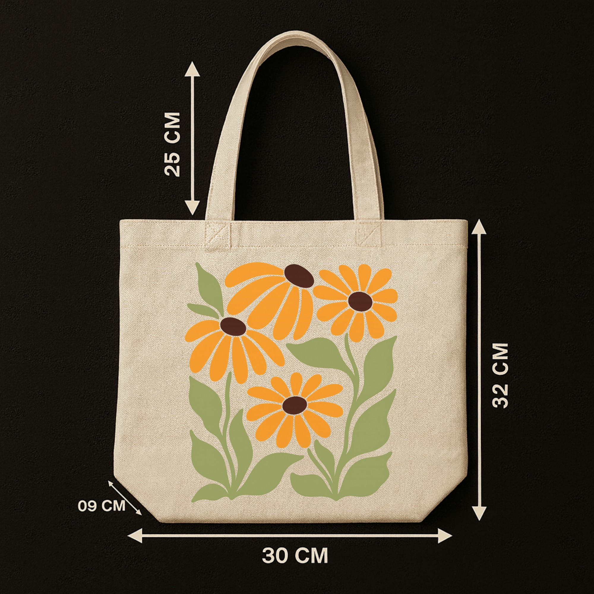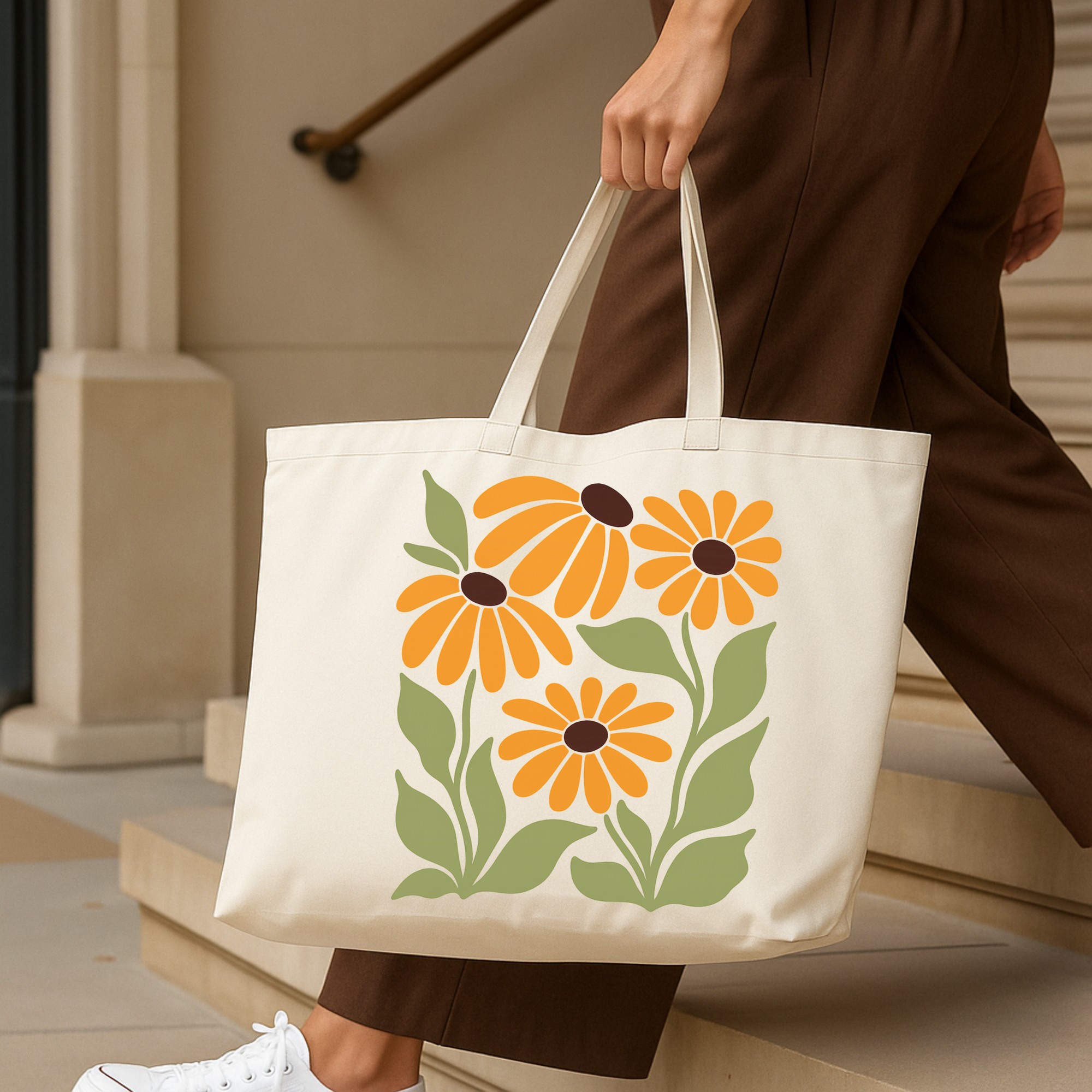 Golden Hour Aesthetic: Features a bold, retro-inspired sunflower print in warm oranges and greens. It pops beautifully against the natural cream canvas, giving off major “Plant Mom” and summer energy.